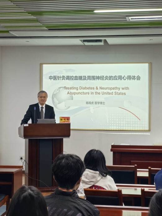 2025年10月20日,由针灸推拿学院·养生康复学院主办的“承淡安传承工作坊”学术活动在图书馆309启悟学术交流室成功举行。本期活动特邀我校针药结合教育部重点实验室兼职教授、澳门科技大学博士生导师、瑞士中医药大学一级教授、美国俄亥俄大学医学院临床教授、知名中医专家杨观虎教授,作题为“针灸调控血糖及周围神经炎的应用心得体会”的专题报告。讲座由学院副院长卞尧尧主持,针药结合教育部重点实验室成员及学院师生代表参与。