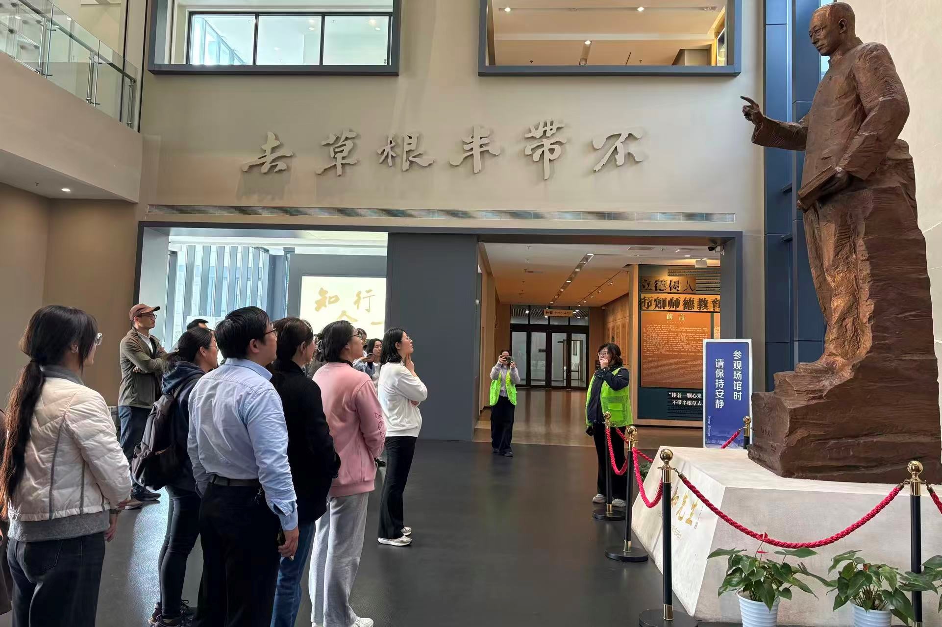 步入1.1万平方米的师德教育馆,吴为山教授创作的陶行知青铜塑像与“捧着一颗心来,不带半根草去”的名言素壁相映成辉,瞬间将党员们带入深邃的教育沉思中。在讲解员引导下,大家依次参观“理想信念”、“道德情操”、“仁爱之心”等主题展区,1600 余件史料文物串联起陶先生创办晓庄师范、推行平民教育的峥嵘岁月。当看到《普及教育方案》中“改造一百万个乡村”的宏愿手稿时,全体党员们深感陶先生‘教学做合一’的理念与中医药‘知行合一’的育人传统一脉相承,我们既要教医术更要传医德。